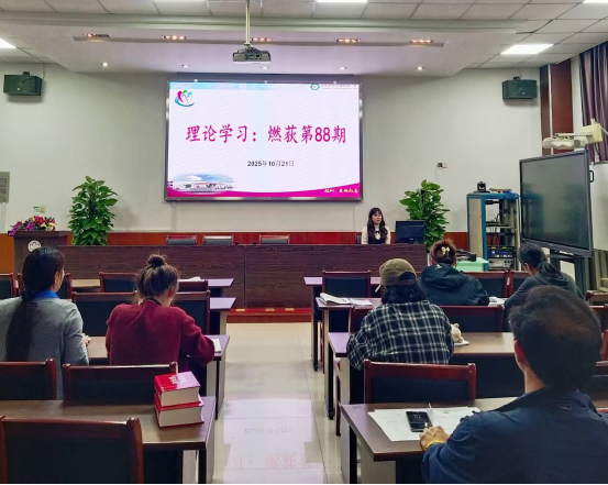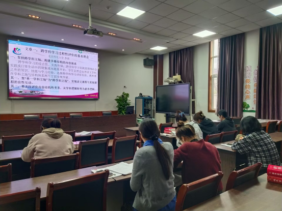 2025年10月21日下午,高语组教师在学校多功能教室开展了燃荻理论学习,本次学习内容是《燃荻》88期《主题:跨学科主题学习课堂评价》。老师们集中后重点学习了两篇文章,分别是北京师范大学李倩撰写的《跨学科学习过程性评价的基本理念》和朱四萍撰写的《跨学科主题学习评价实践探索——基于评价内容、任务与结果三维视角》。