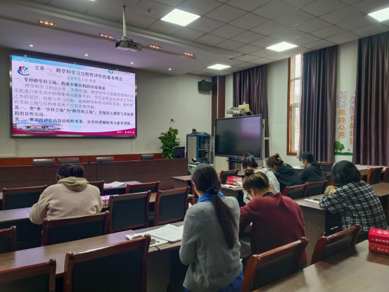 2025年10月21日下午,高语组教师在学校多功能教室开展了燃荻理论学习,本次学习内容是《燃荻》88期《主题:跨学科主题学习课堂评价》。老师们集中后重点学习了两篇文章,分别是北京师范大学李倩撰写的《跨学科学习过程性评价的基本理念》和朱四萍撰写的《跨学科主题学习评价实践探索——基于评价内容、任务与结果三维视角》。