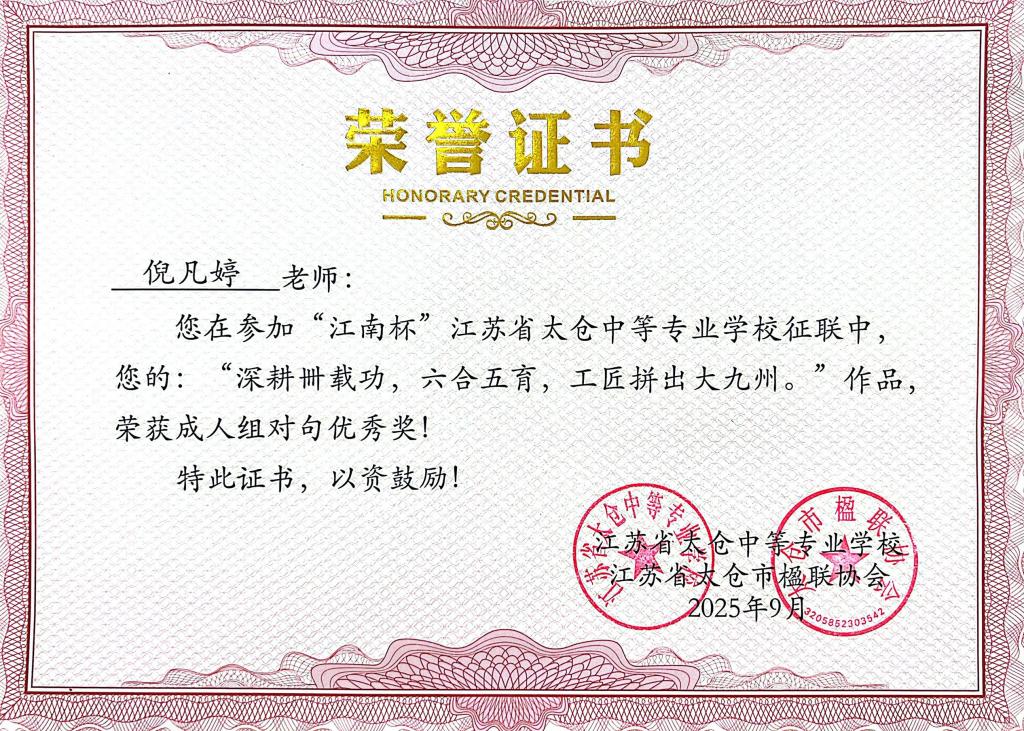 校园喜讯——祝贺倪凡婷老师在“江南杯”江苏省太仓中等专业学校征联中荣获优秀奖