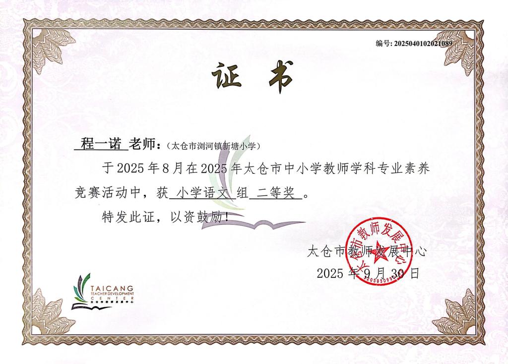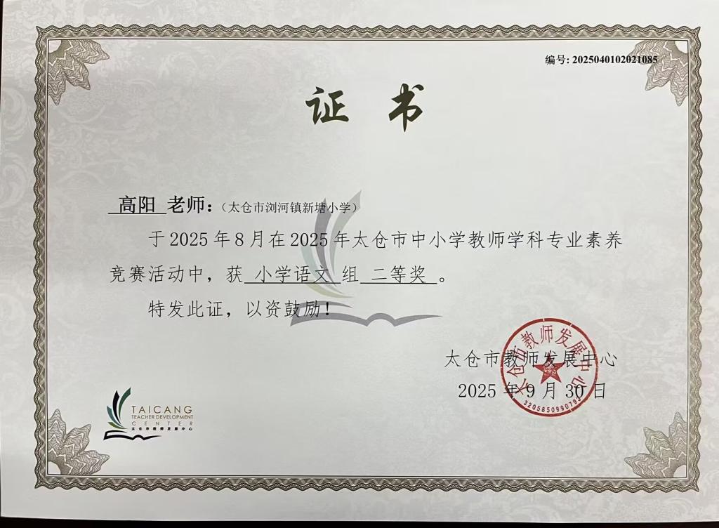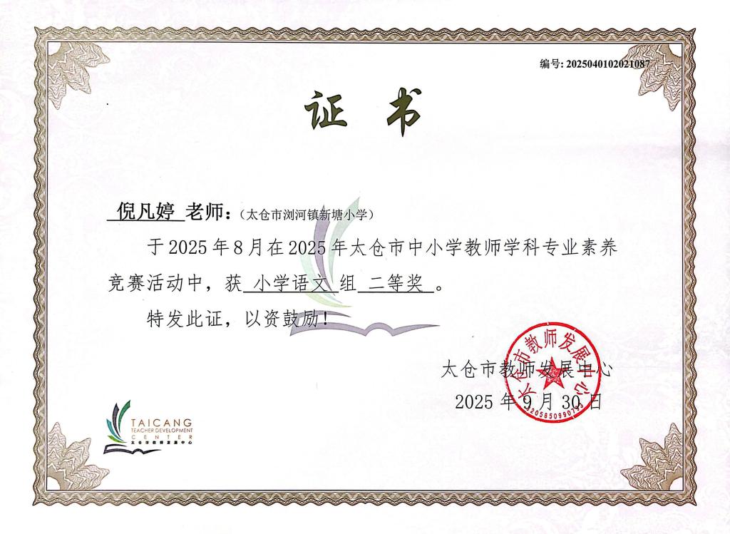 校园喜讯——祝贺倪凡婷、陆亭羽等九位教师在2025年太仓市教师学科专业素养竞赛中获二等奖