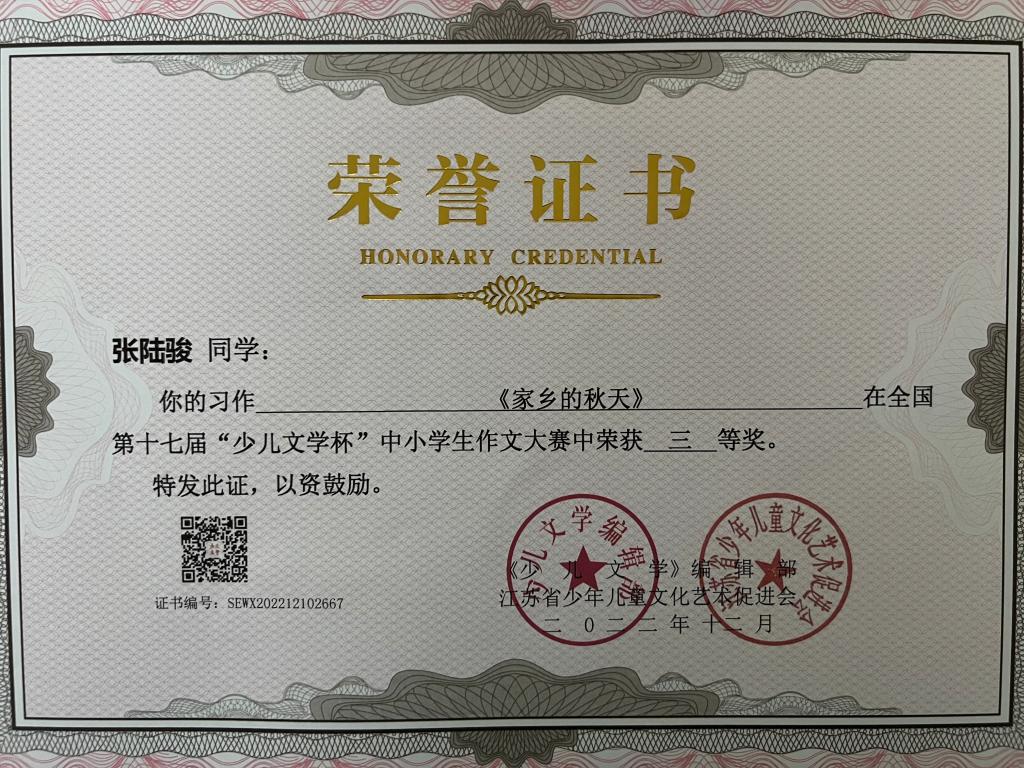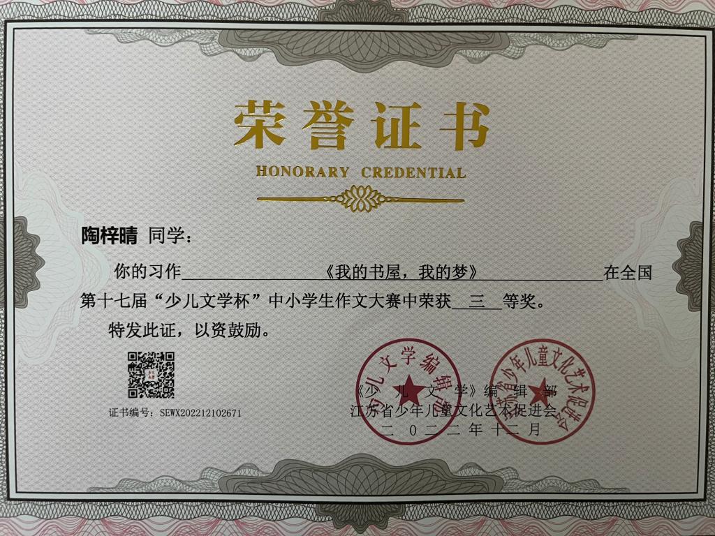 喜讯——祝贺周雅雯、严岩等同学在第十七届“少儿文学杯”中小学生作文大赛中获奖