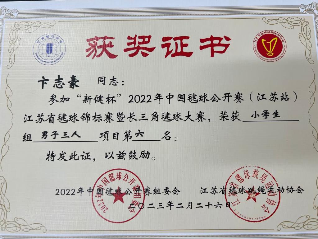 喜讯——祝贺葛浩轩、王保、卞志豪同学在2022年中国毽球公开赛(江苏站)中荣获男子三人项目第六名