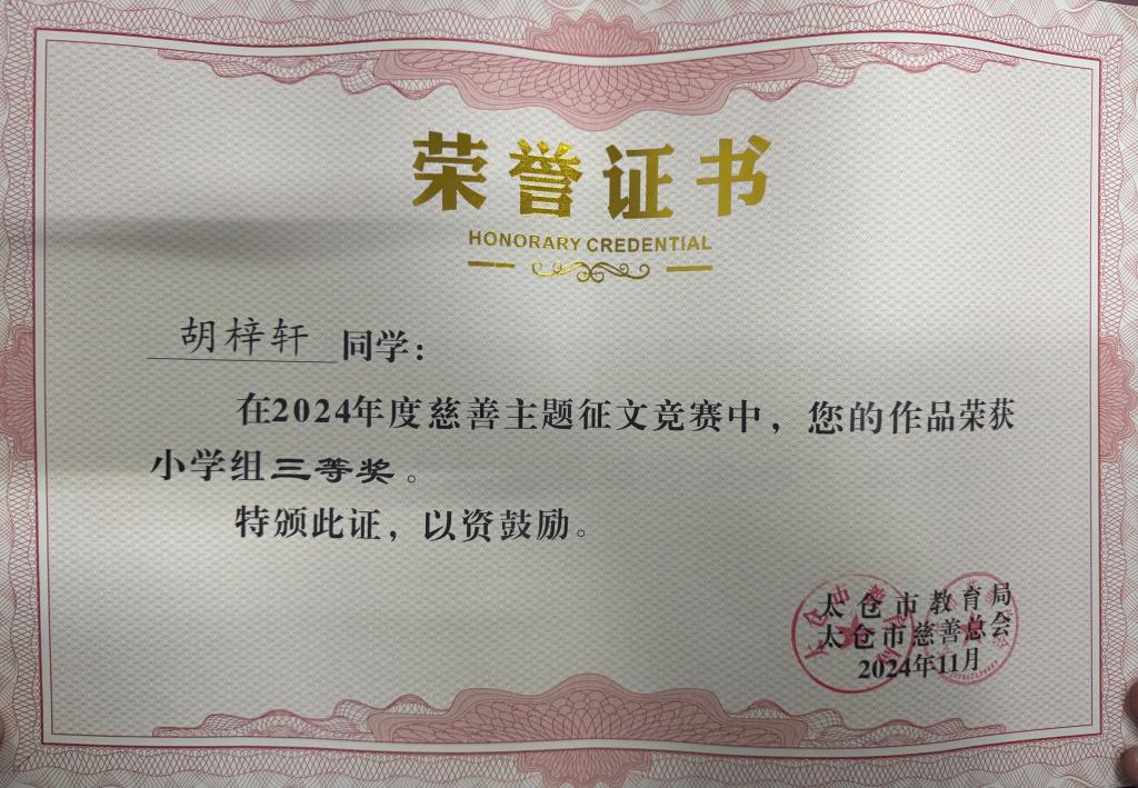 喜讯——祝贺项天语、胡梓轩同学在2024年度慈善主题征文竞赛中获奖